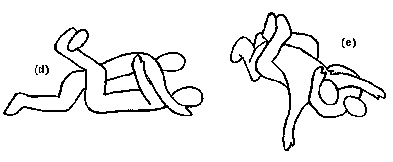 In the near guard (d) \& (e) the person on the bottom has their legs wrapped around the hips of the top person. The opponent is clinched close, so that they do not have the distance to punch. The bottom person uses their legs to control the hips of the top person.