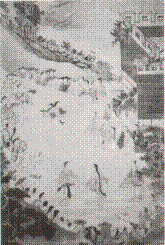 However, the Japanese colonial government totally prohibited all folkloric games including takkyon in the process of suppressing the Korean people. The martial art taekkyondo(Taekwondo) had been secretly handed down only by the masters of the art until the liberation of the country in 1945. Song Duk-Ki, one of the then masters, is still alive with the age of over 80 and testifies that his master was Im Ho who was reputed for his excellent skills of taekkyondo, "jumping over the walls and running through the wood just like a tiger."
